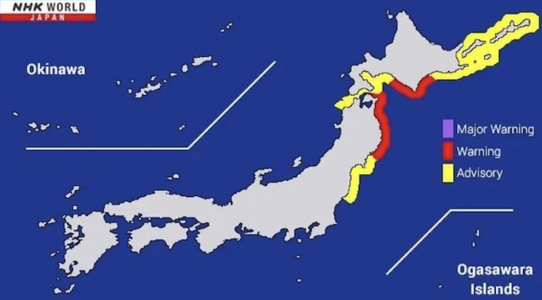 Những khu vực ban bố cảnh báo sóng thần ở Đông Bắc Nhật Bản. Đồ họa: NHK