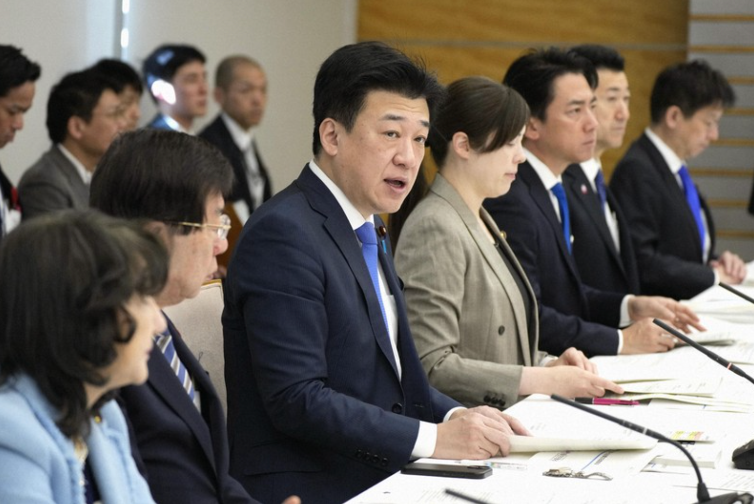 Chánh Văn phòng Nội các Nhật Bản Kihara Minoru (thứ ba từ trái sang) phát biểu tại buổi làm việc về chính sách người nước ngoài ngày 23-1. Ảnh: Mainichi