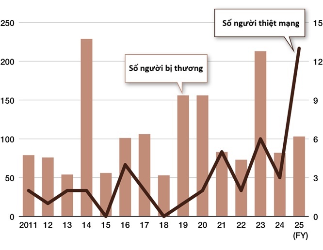 Biểu đồ số người thiệt mạng và bị thương do gấu theo năm tài khóa từ 2011 đến nay. Tuy số người bị thương không có đột biến nhưng số người thiệt mạng do gấu tấn công tăng mạnh. Đồ họa: Nippon.