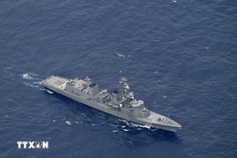 Tàu của Lực lượng phòng vệ biển Nhật Bản được triển khai ngoài khơi Torishima, hồi tháng Tư năm ngoái. (Ảnh: Kyodo/TTXVN)