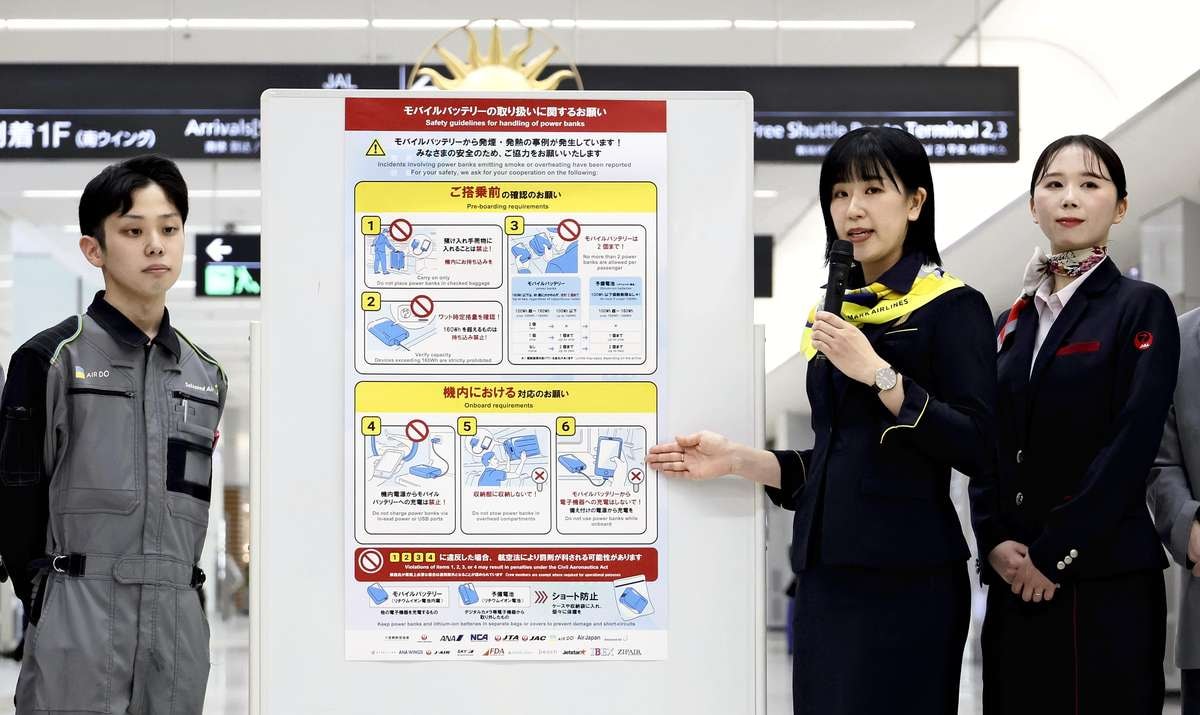 Tiếp viên hàng không (giữa) giới thiệu quy định mới về sạc dự phòng tại sân bay Haneda, phía nam thủ đô Tokyo ngày 14-4. Ảnh: Japannews