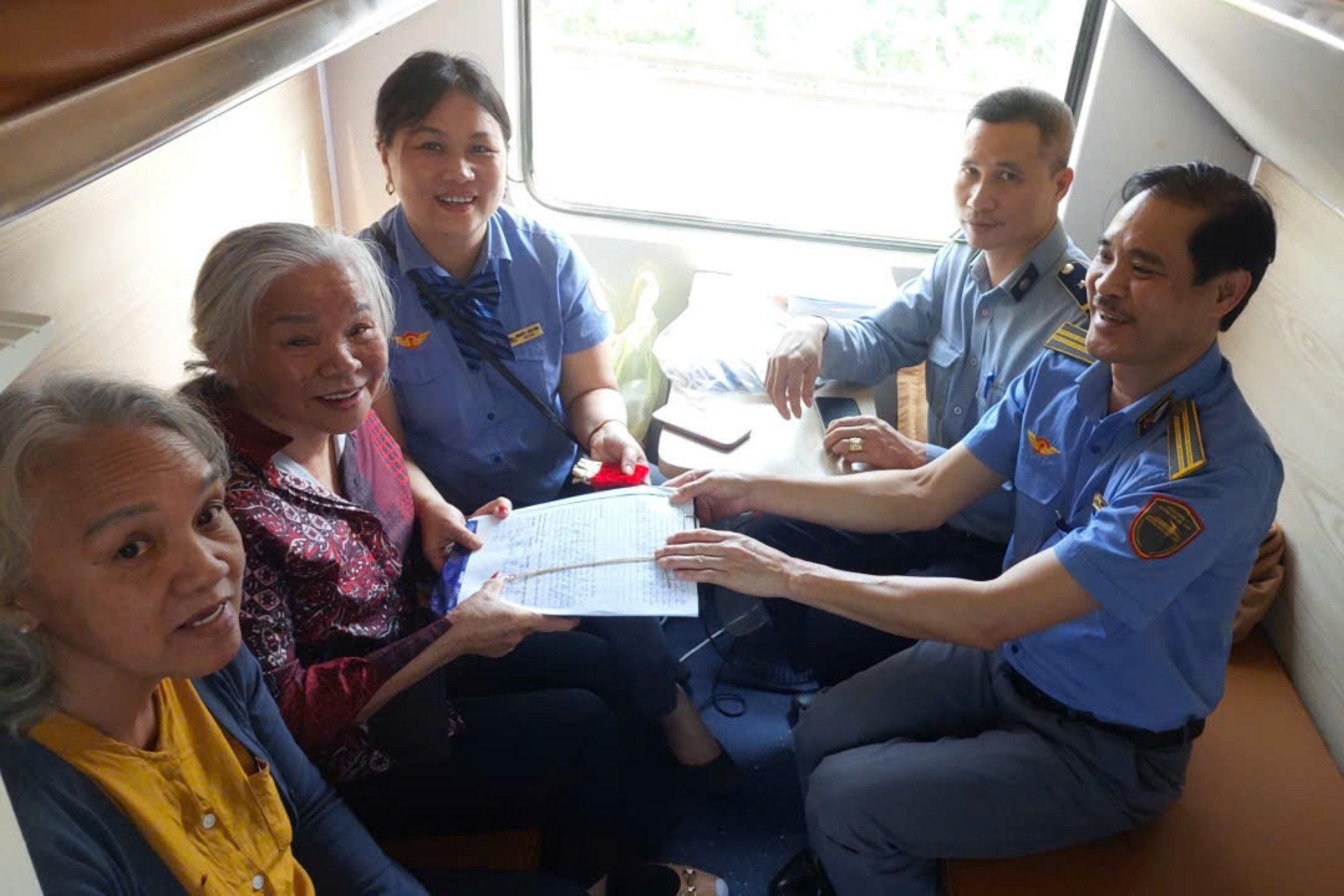 Các tiếp viên trên tàu làm thủ tục trao trả tài sản cho bà Thêm. Ảnh: Đ.S