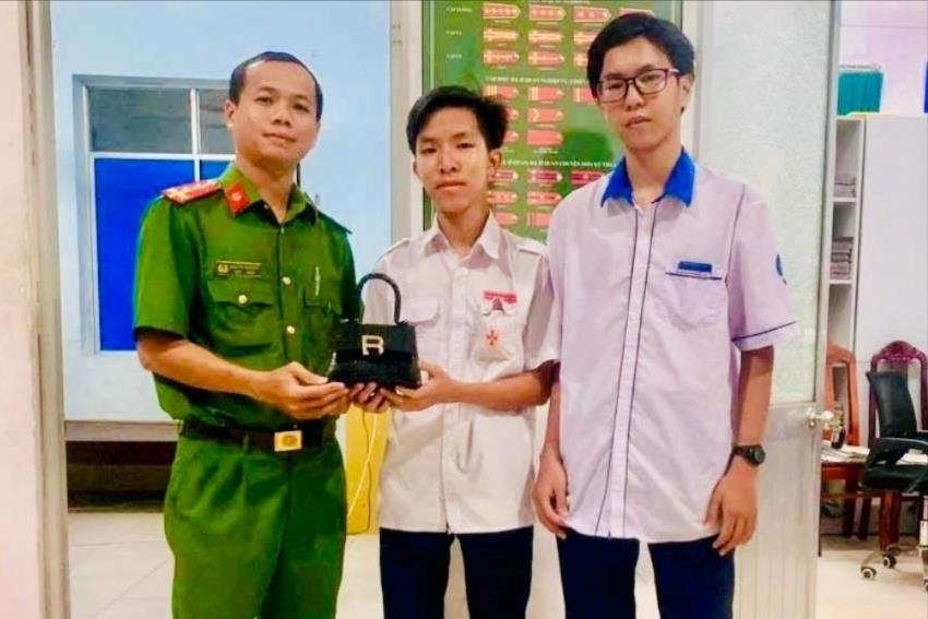 Trước đó, khi đi qua khu vực cây đổ Thiên Phú, hai em phát hiện túi xách màu đen bên đường. Kiểm tra bên trong có tiền cùng nhiều giấy tờ, các em đã mang toàn bộ tài sản đến giao nộp cho Công an phường Phước Hội để hỗ trợ tìm người đánh rơi.