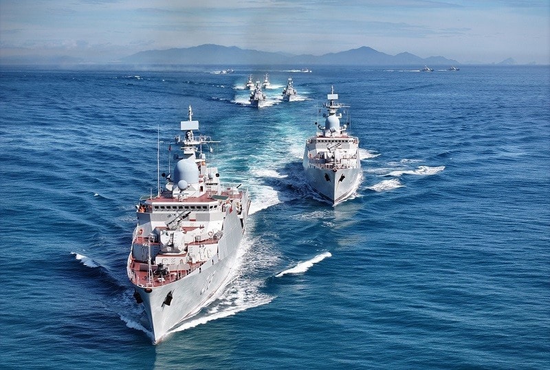 Hai tàu hộ vệ tên lửa hiện đại 015 - Trần Hưng Đạo và 016 - Quang Trung của Lữ đoàn 162, Vùng 4 Hải quân dẫn đầu các chiến hạm luyện tập vận động đội hình trên biển. (Ảnh: QUÂN CHỦNG HẢI QUÂN)