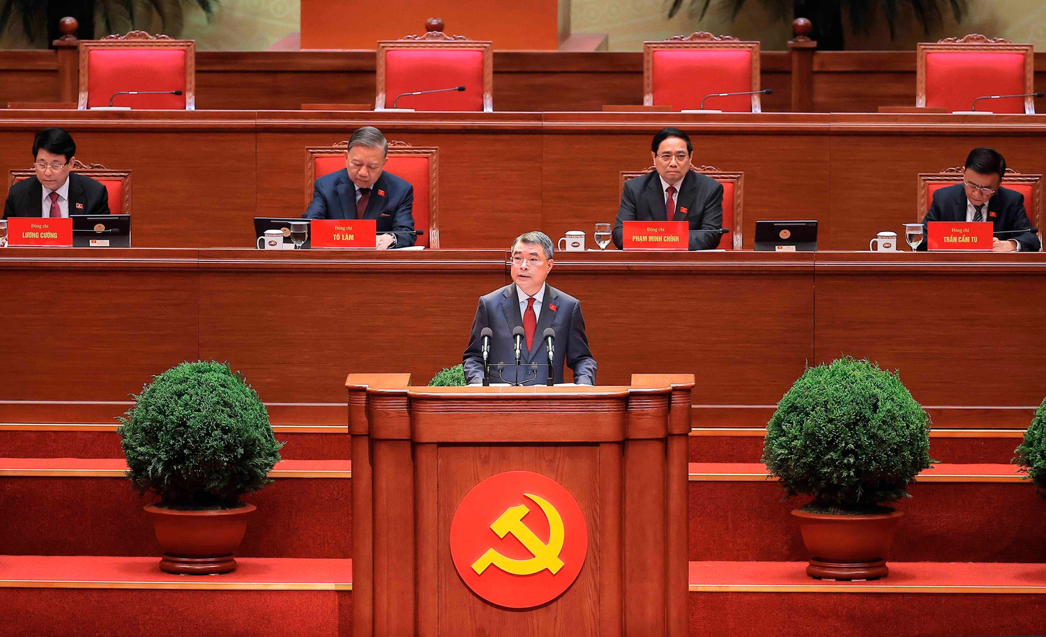 Đồng chí Trần Cẩm Tú, Ủy viên Bộ Chính trị, Thường trực Ban Bí thư tuyên bố lý do, khai mạc phiên họp trù bị Đại hội XIV của Đảng. Ảnh: TTXVN.