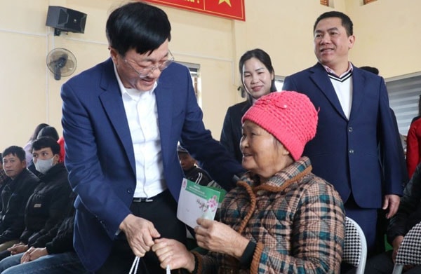 Tổng Giám đốc Dương Quyết Thắng và Phó Chủ tịch Trần Thanh Nhàn trao 100 suất quà Tết cho các đối tượng chính sách tại xã Chiến Thắng.