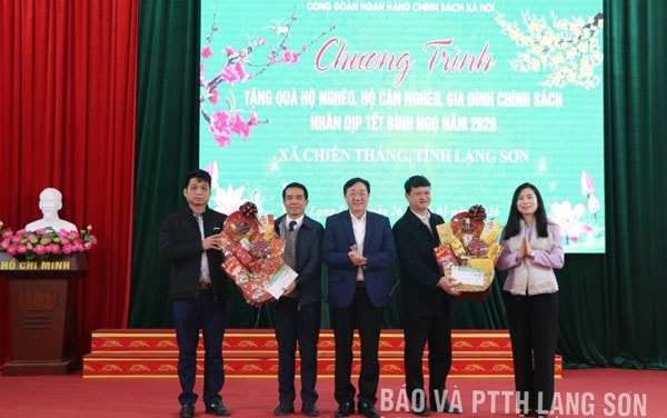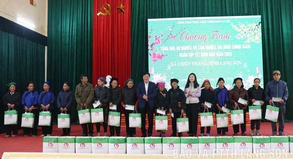 Tại đây, Đoàn công tác của NHCSXH đã tặng 100 suất quà cho các hộ nghèo, hộ cận nghèo, gia đình chính sách tại xã Chiến Thắng, mỗi suất trị giá 1,2 triệu đồng, bao gồm tiền mặt và bánh kẹo, nhu yếu phẩm… Tổng trị giá các phần quà là 120 triệu đồng.