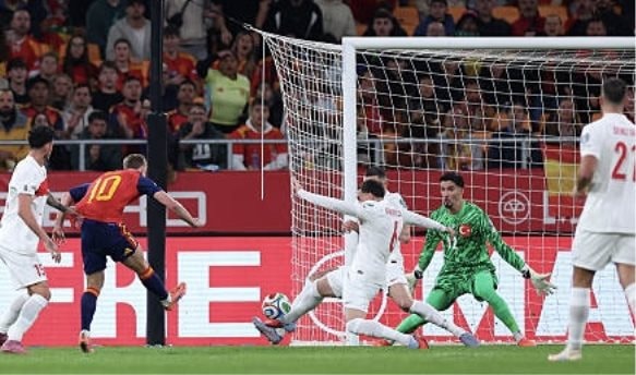 Với cục diện đã an bài, một bên “muốn giành vé” cũng không được, còn một bên “muốn bỏ vé” cũng không xong. Do vậy, Tây Ban Nha và Thổ Nhĩ Kỳ nhập cuộc khá cởi mở ngay sau tiếng còi khai cuộc. Ngay phút thứ 4, đường tạt của Marc Cucurella tìm thấy Olmo trong vòng cấm và tiền vệ Barcelona xử lý gọn gàng trước khi tung cú dứt điểm hiểm hóc mở tỷ số. Olmo sau đó hai lần suýt lập cú đúp với những pha sút xa nhưng đều bị thủ môn Bayindir xuất sắc cản phá. Ngay trước giờ nghỉ giải lao, khi Deniz Gul phản xạ nhanh đệm bóng sau một pha phạt góc làm tung lưới Tây Ban Nha quân bình tỉ số.