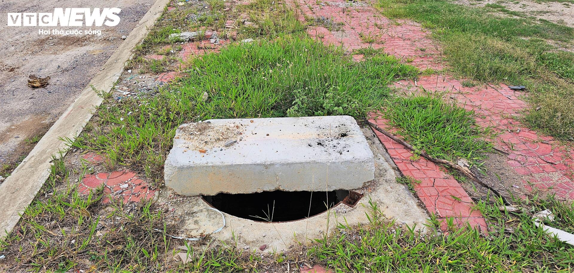 Cống thoát nước trên vỉa hè thuộc hệ thống hạ tầng kỹ thuật Khu đô thị mới Long Vân bị mất nắp và được che chắn tạm bợ bằng khối bê tông không an toàn.