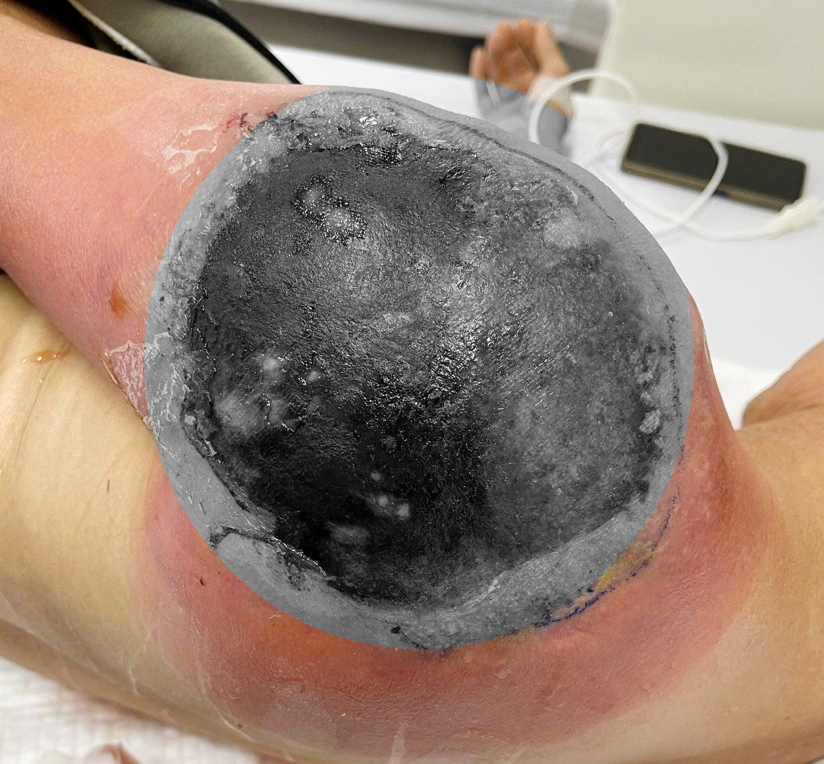 Bệnh nhân đã được phẫu thuật sớm, cắt lọc hết phần bị hoại tử kết hợp với điều trị kháng sinh phù hợp, các thuốc chống viêm - giảm đau, và chăm sóc tại chỗ.
