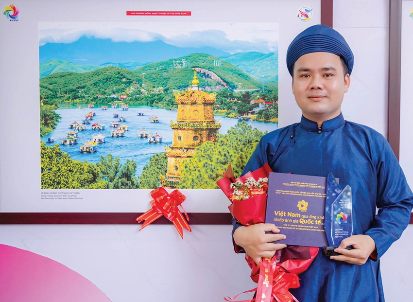 Nghệ sĩ nhiếp ảnh Lê Đình Hoàng bên tác phẩm “Sông Hương ngày hội điện Huệ Nam” - Đồng hạng Giải thưởng 20 tác phẩm xuất sắc nhất tại Cuộc thi “Festival Nhiếp ảnh quốc tế Việt Nam” lần thứ ba - Huế 2025