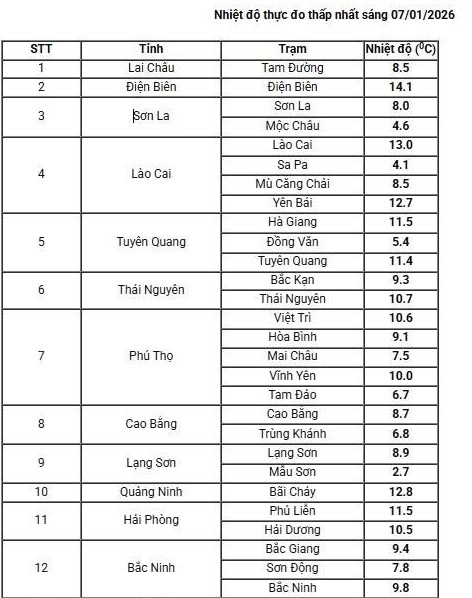 Nhiệt độ ở các tỉnh chịu ảnh hưởng không khí lạnh thực đo thấp nhất sáng nay (7/1)