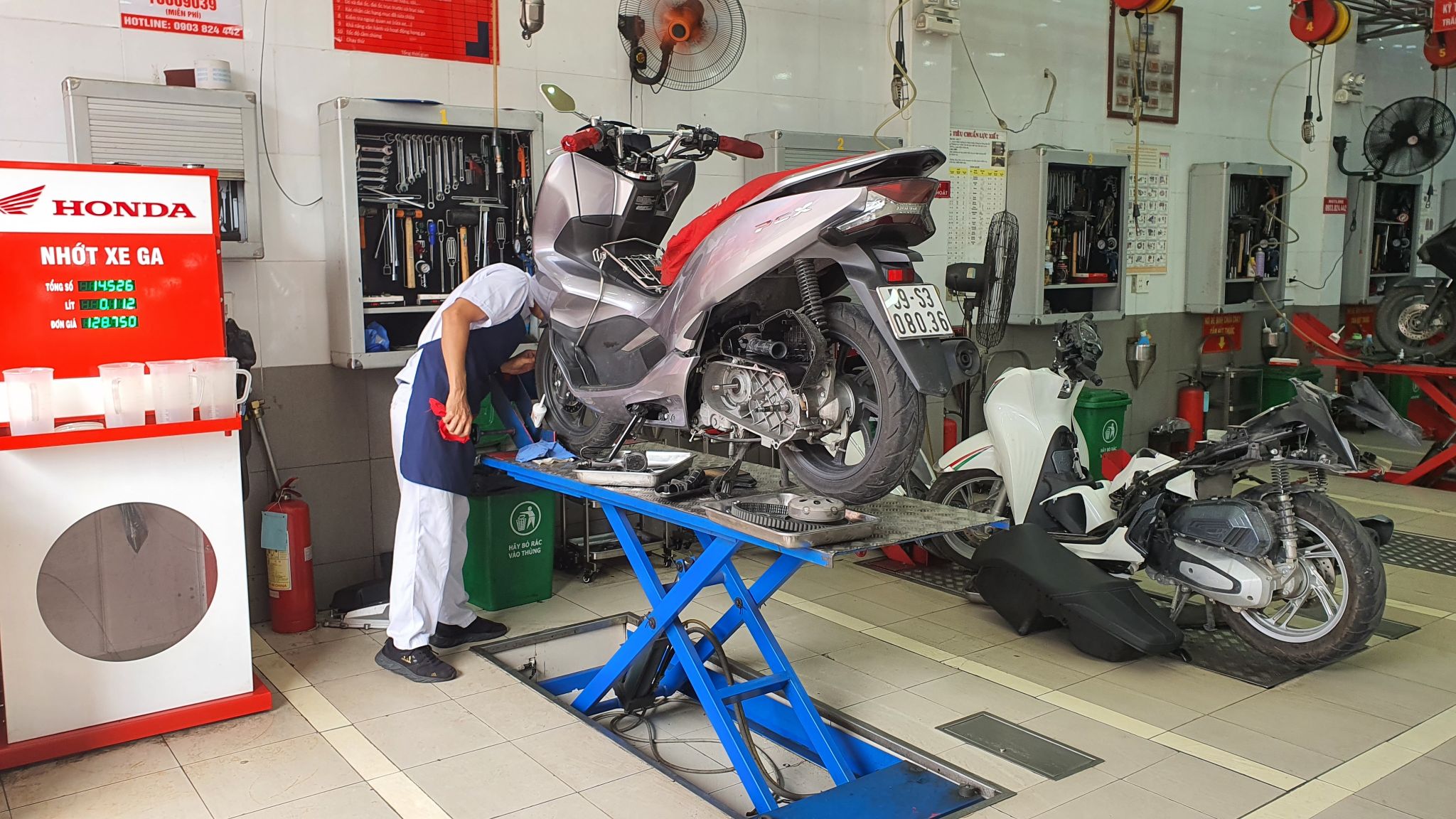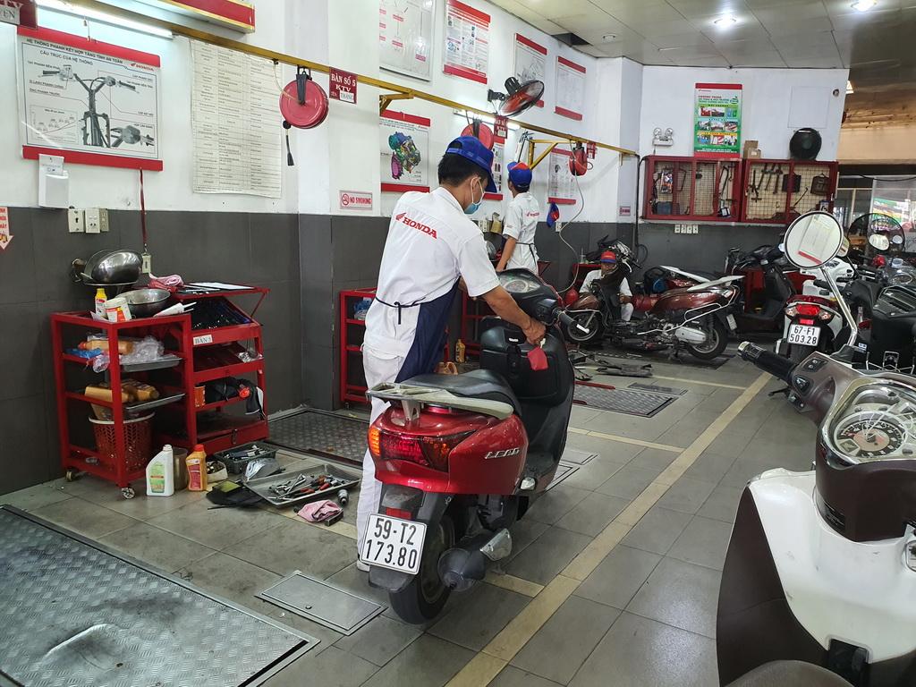 Nhân viên kỹ thuật đang bảo dưỡng xe máy tại một cơ sở ở TP.HCM. Ảnh: TN