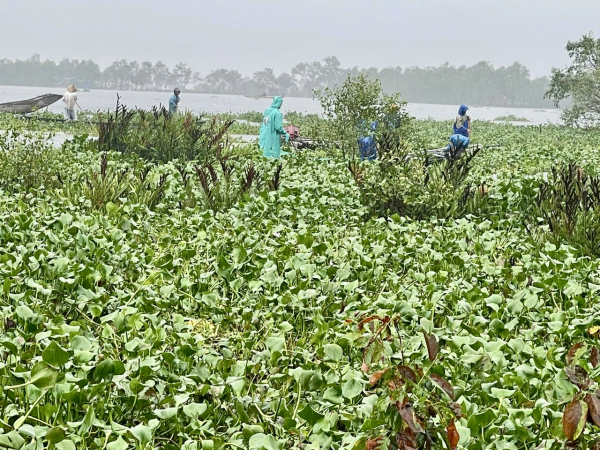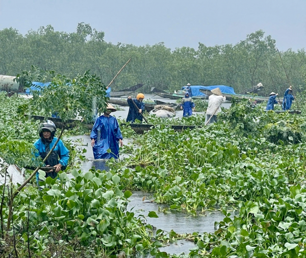 Anh Phan Văn Huỳnh, Tổ trưởng Tổ An ninh cơ sở thôn Ngư Mỹ Thạnh, xã Đan Điền cho biết, do ảnh hưởng của bão lũ và mưa lớn trong 2 ngày qua, lượng bèo lục bình từ các nơi đổ về địa bàn thôn Ngư Mỹ Thạnh ước chừng khoảng hơn 20 tấn. Số bèo lục bình dày đặc cả vùng phá Tam Giang thuộc thôn Ngư Mỹ Thạnh và các thôn lận cận.