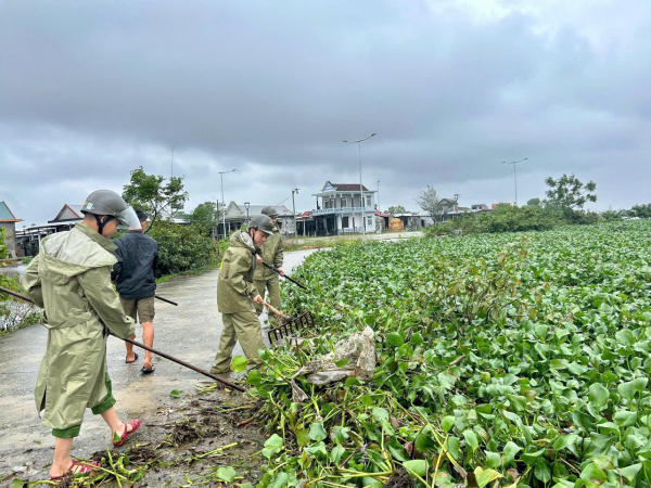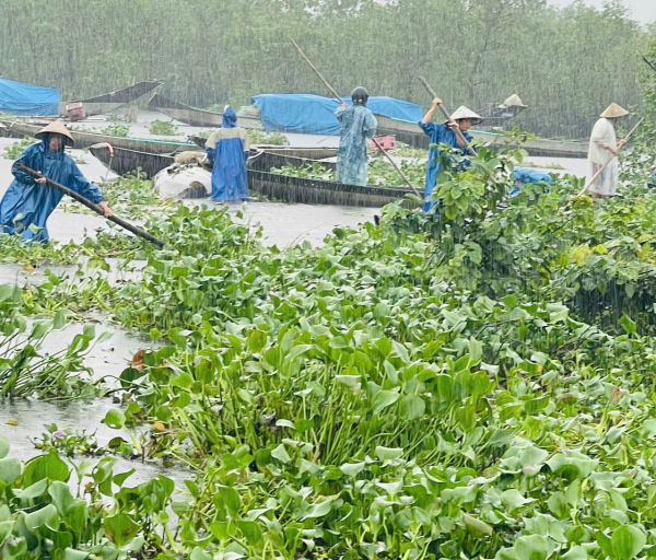 Trưa 24/10, tranh thủ khi nước lũ vẫn còn cao, nhằm khơi thông dòng chảy, giúp nước lũ thoát nhanh hơn; hàng chục người dân ở thôn Ngư Mỹ Thạnh (xã Đan Điền, TP Huế) đã chung sức đẩy bèo lục bình ra khỏi hệ thống đầm phá, sông ngòi. Việc làm này còn được sự hỗ trợ của Công an xã Đan Điền và lực lượng tham gia bảo vệ ANTT ở cơ sở.