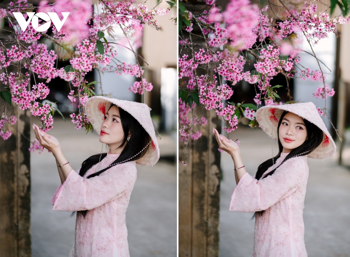 Một góc hoa mai anh đào nở trong con hẻm nhỏ đường Hùng Vương, trở thành "tọa độ" được nhiều bạn trẻ ưa thích. Ảnh: Happy Day Travel