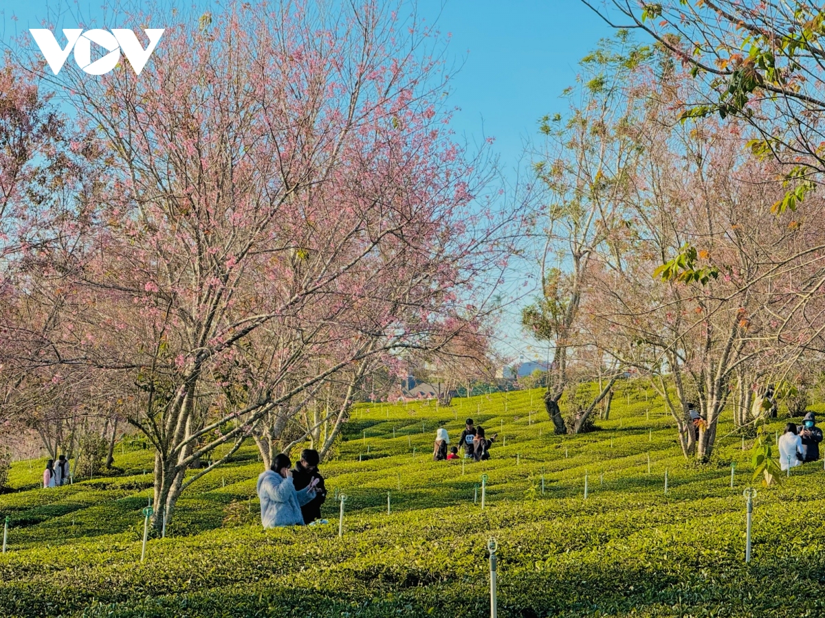 Khu vực đồi chè Cầu Đất - Đà Lạt trung tuần tháng 1/2026, nhiều cây hoa mai anh đào đã bung nở, thu hút du khách thập phương đến thưởng lãm, chụp ảnh check-in.