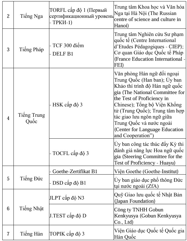 Danh sách các chứng chỉ ngoại ngữ được công nhận để miễn thi ngoại ngữ.