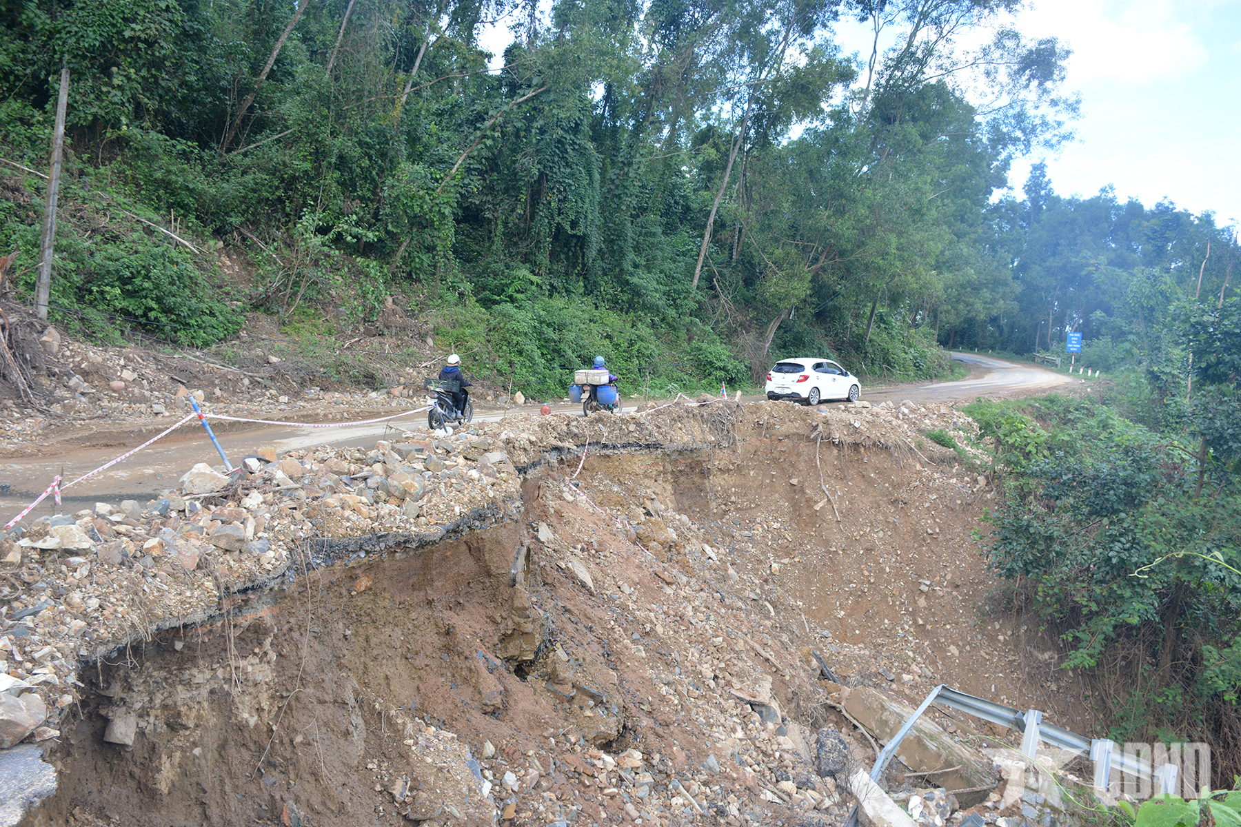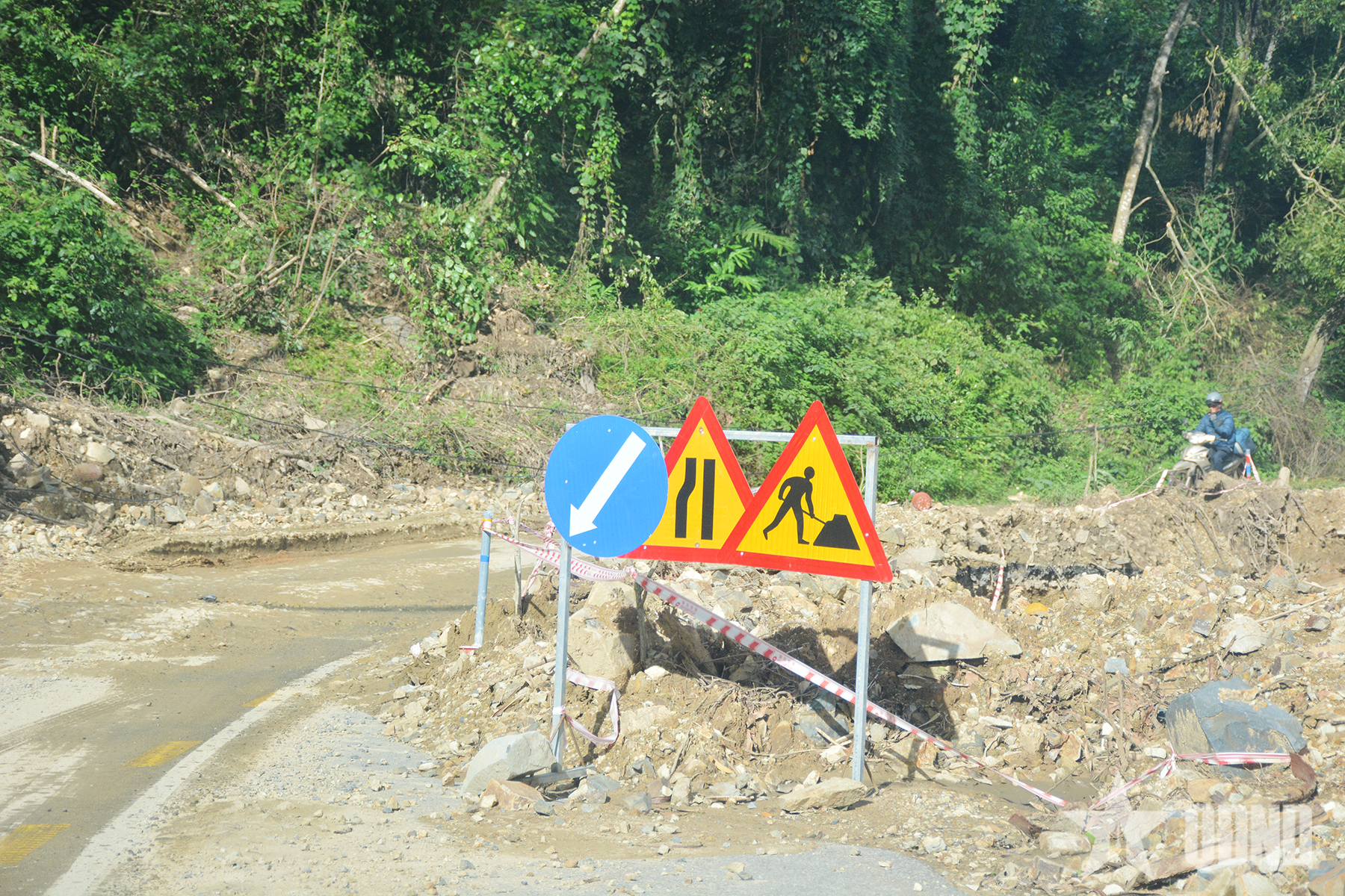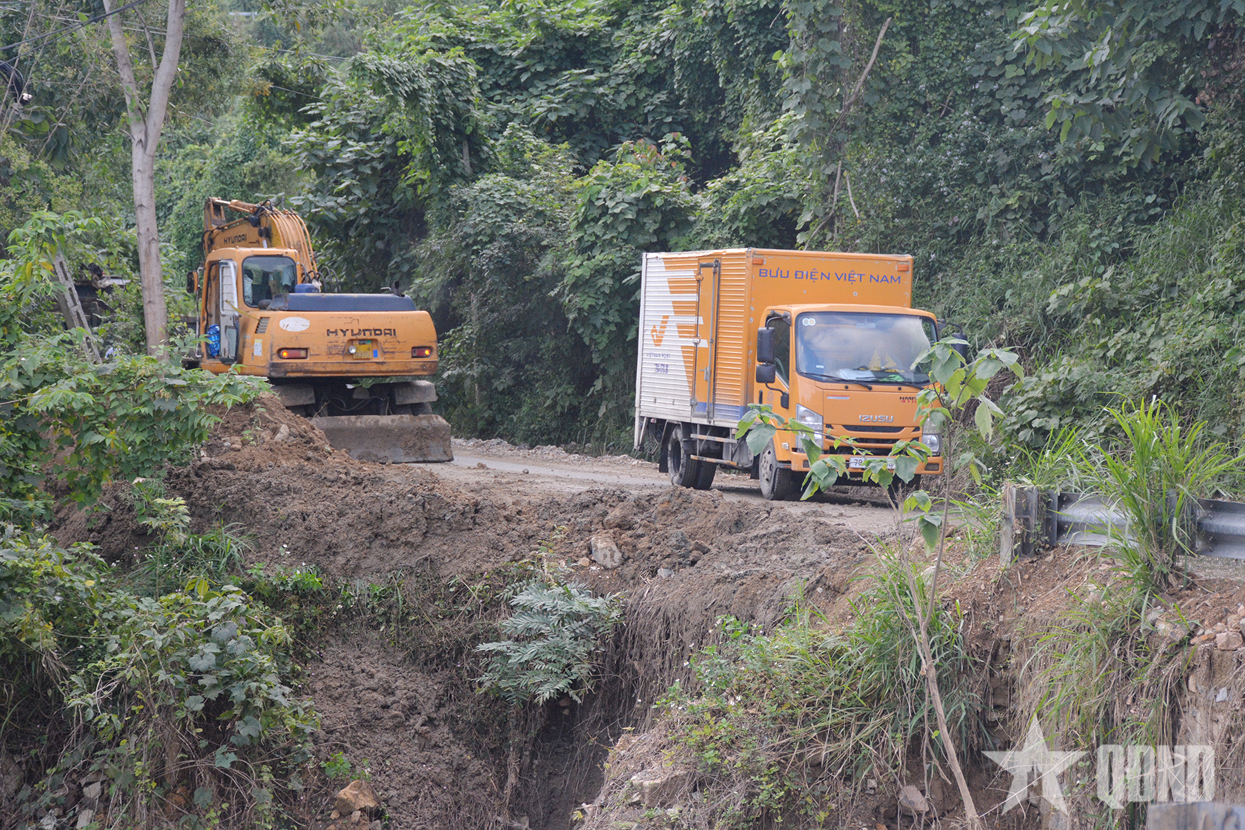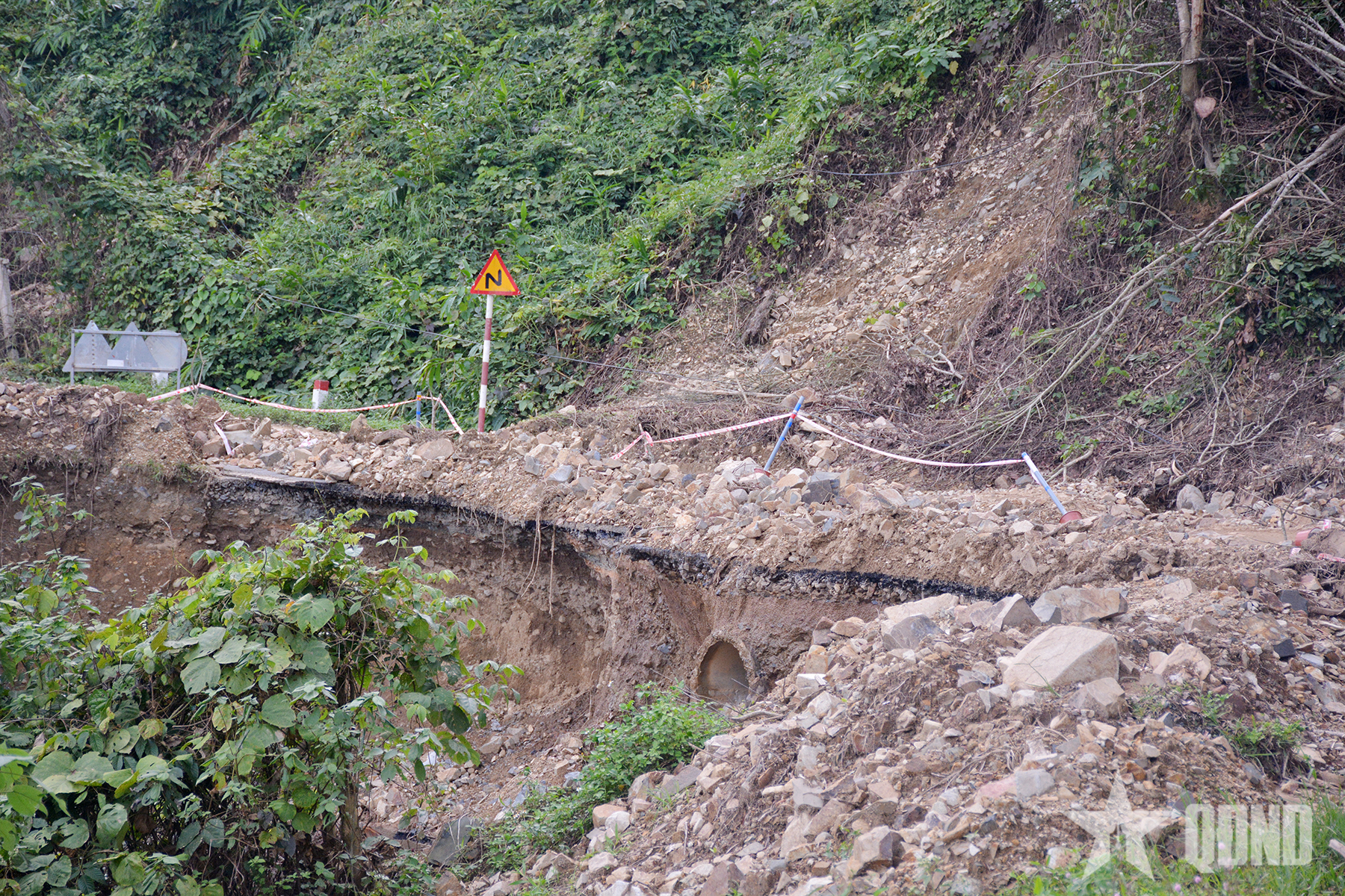 Tại hiện trường, nhiều đoạn nền đường nhựa bị khoét sâu, tạo thành những hố sâu nguy hiểm ngay sát mép vực. Đất đá từ trên núi cao đổ xuống choán hết một phần mặt đường, gây cản trở giao thông. Các đơn vị thi công phải huy động máy xúc, phương tiện chuyên dụng để múc đất đá, san gạt mặt bằng và gia cố lại những điểm sạt lún.