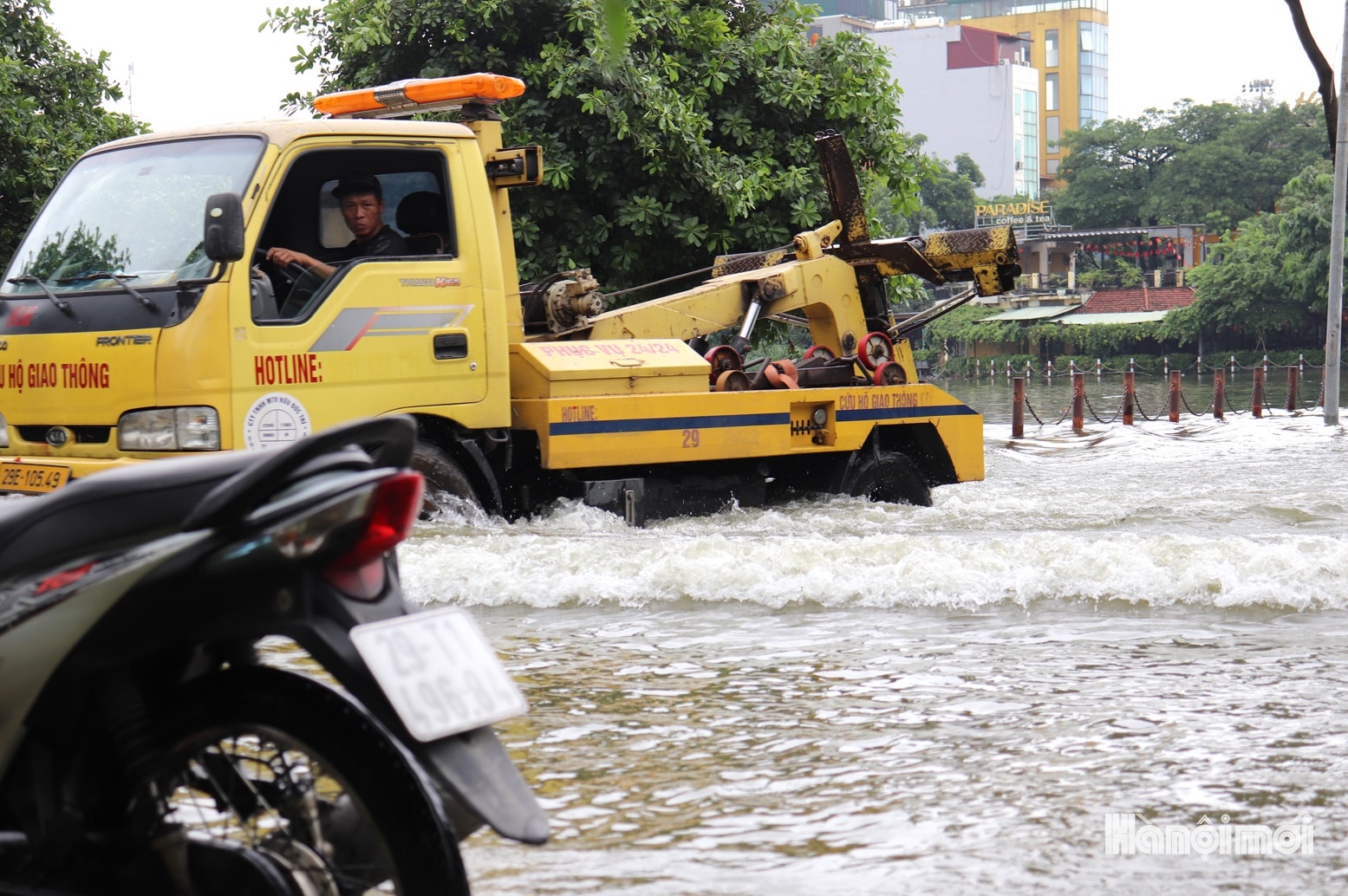 Nhiều phương tiện cố di chuyển qua khu vực ngập sâu. Ảnh: Quang Thái