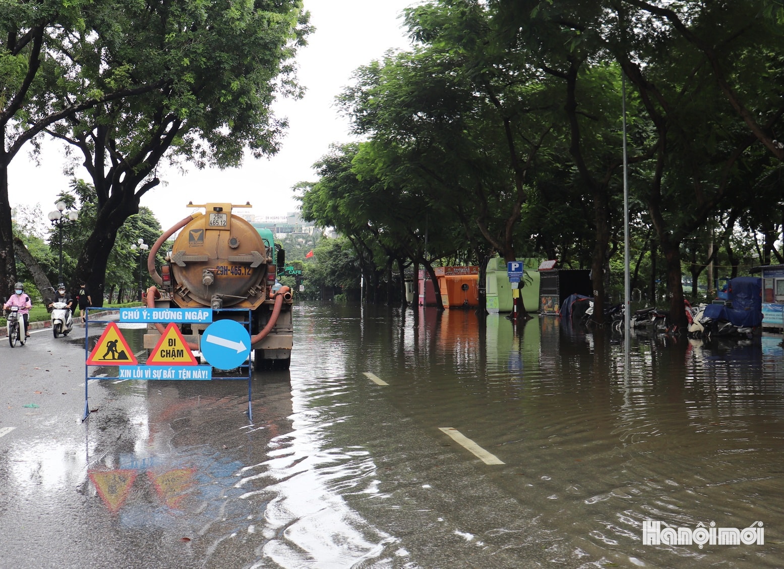 Khu vực nút giao Mễ Trì - Dương Đình Nghệ nước chưa rút hết. Ảnh: Quang Thái