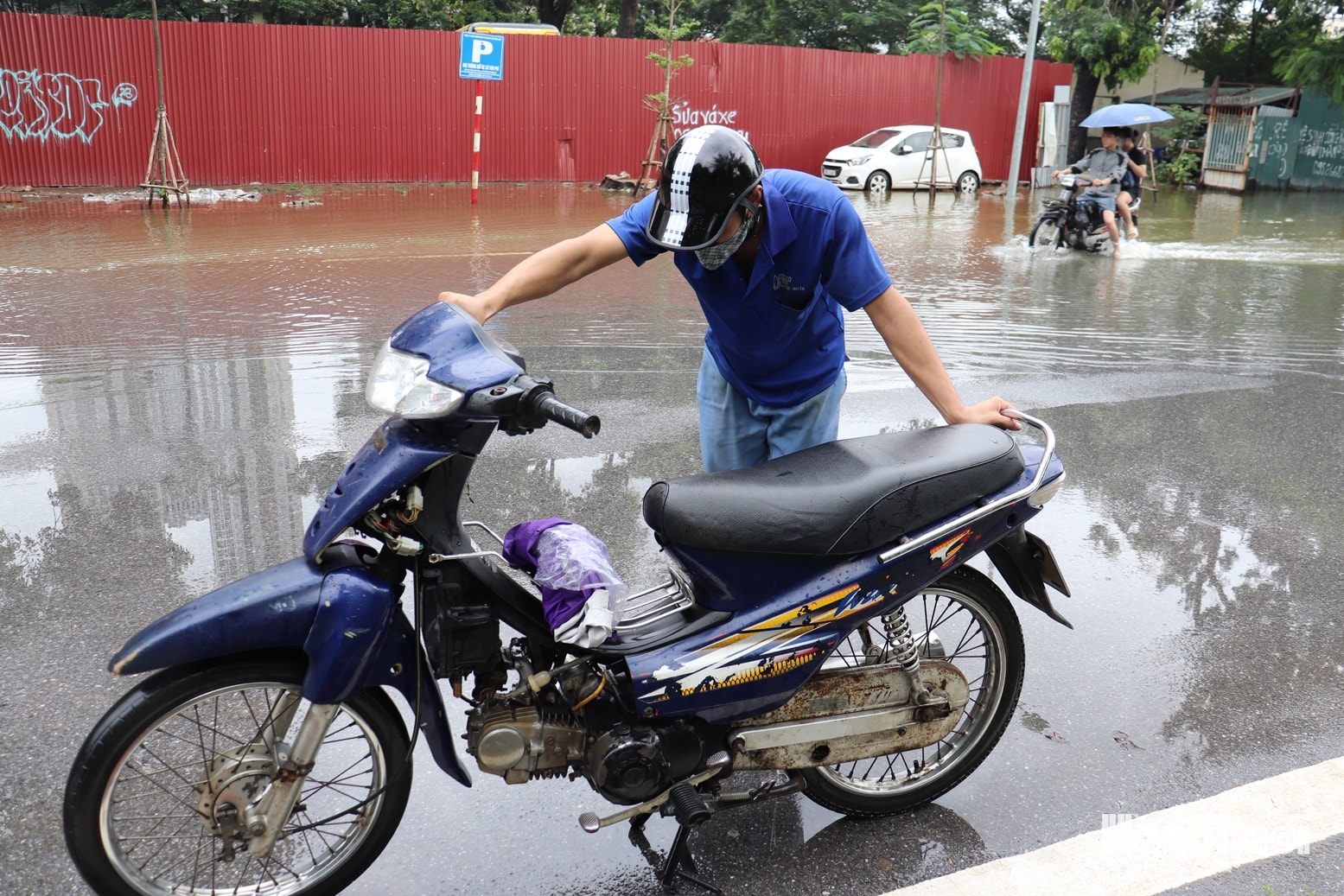 Một xe máy rơi vào cảnh chết máy khi cố vượt qua đoạn đường ngập sâu ở đường hồ Văn Quán (phường Hà Đông). Ảnh: Ngọc Diệp