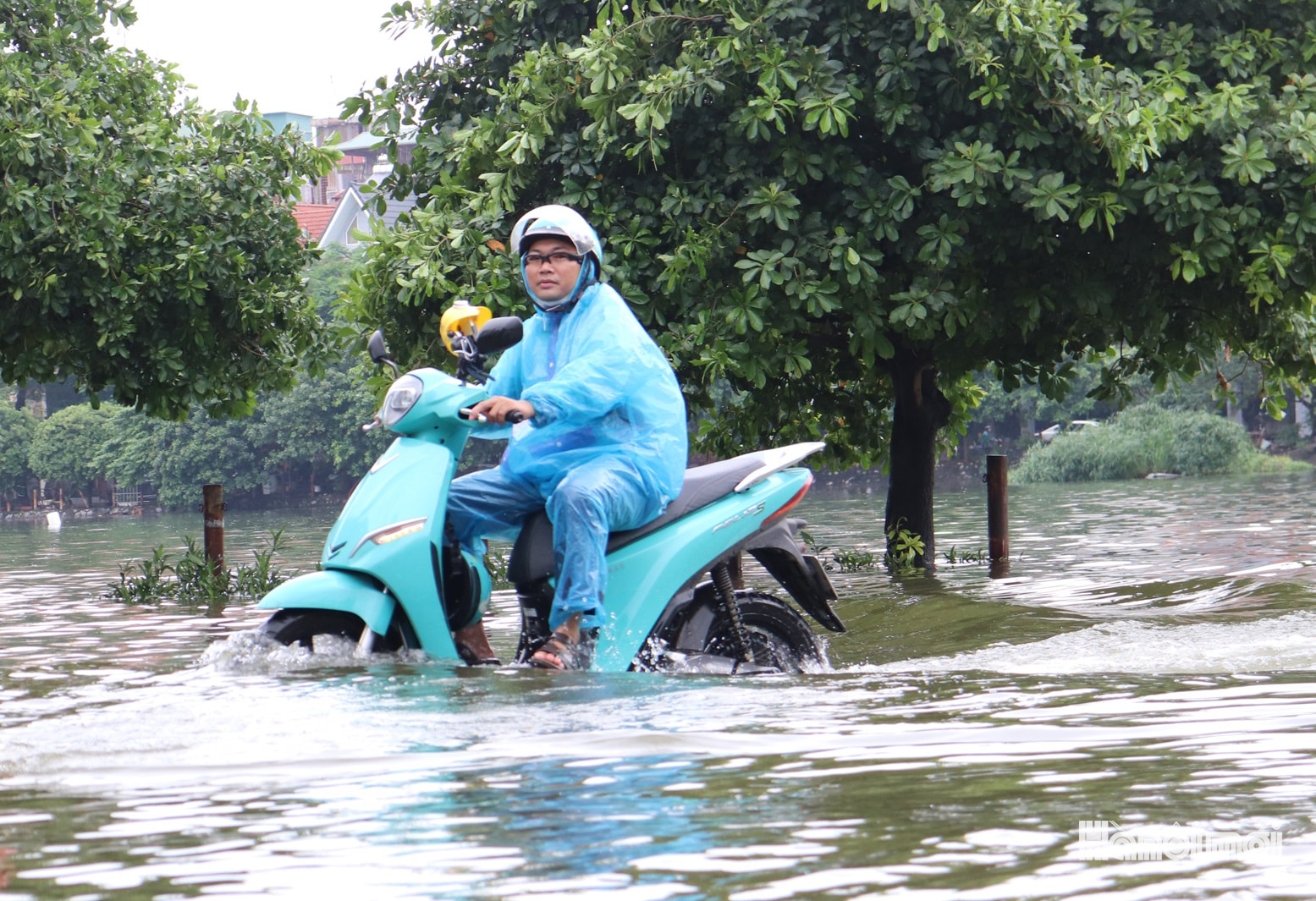 Làn dành cho xe máy trên đường Võ Chí Công còn ngập sâu. Ảnh: Quang Thái