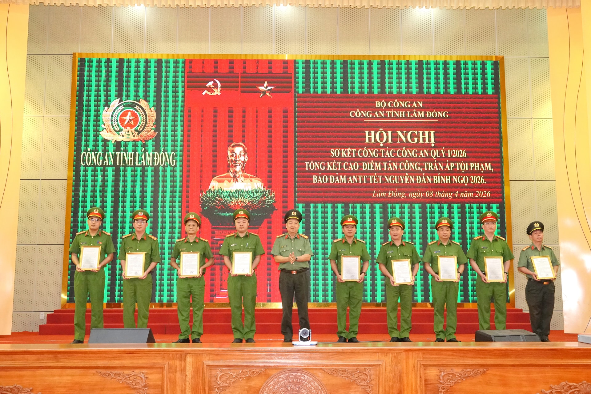 Sáng 8/4, thừa ủy quyền của Bộ Công an, Đại tá Trần Văn Mười, Phó Giám đốc Công an tỉnh Lâm Đồng đã trao quyết định thưởng nóng từ Quỹ Phòng, chống tội phạm Trung ương cho các tập thể có thành tích xuất sắc trong đợt cao điểm tấn công, trấn áp tội phạm, bảo đảm an ninh, trật tự phục vụ Đại hội đại biểu toàn quốc lần thứ XIV của Đảng, bầu cử ĐBQH khóa XVI và HĐND các cấp nhiệm kỳ 2026 - 2031 cùng các dịp lễ, tết, lễ hội đầu xuân 2026.