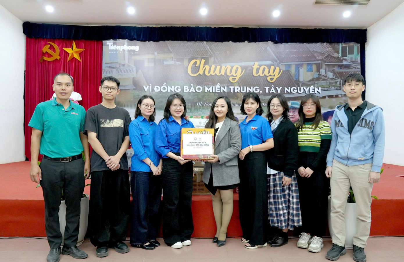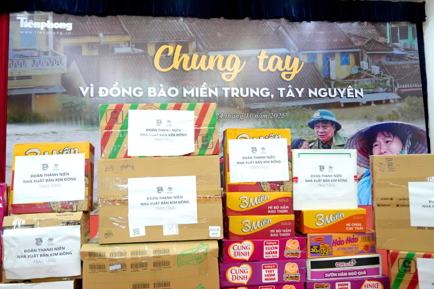 Tại trụ sở Báo Tiền Phong (số 15 Hồ Xuân Hương, TP Hà Nội), Đoàn cơ sở Nhà xuất bản Kim Đồng trao tặng nhiều nhu yếu phẩm thiết yếu gồm mì tôm, bánh, sữa… trị giá hơn 28 triệu đồng, nhằm hỗ trợ người dân vùng lũ khắc phục khó khăn.