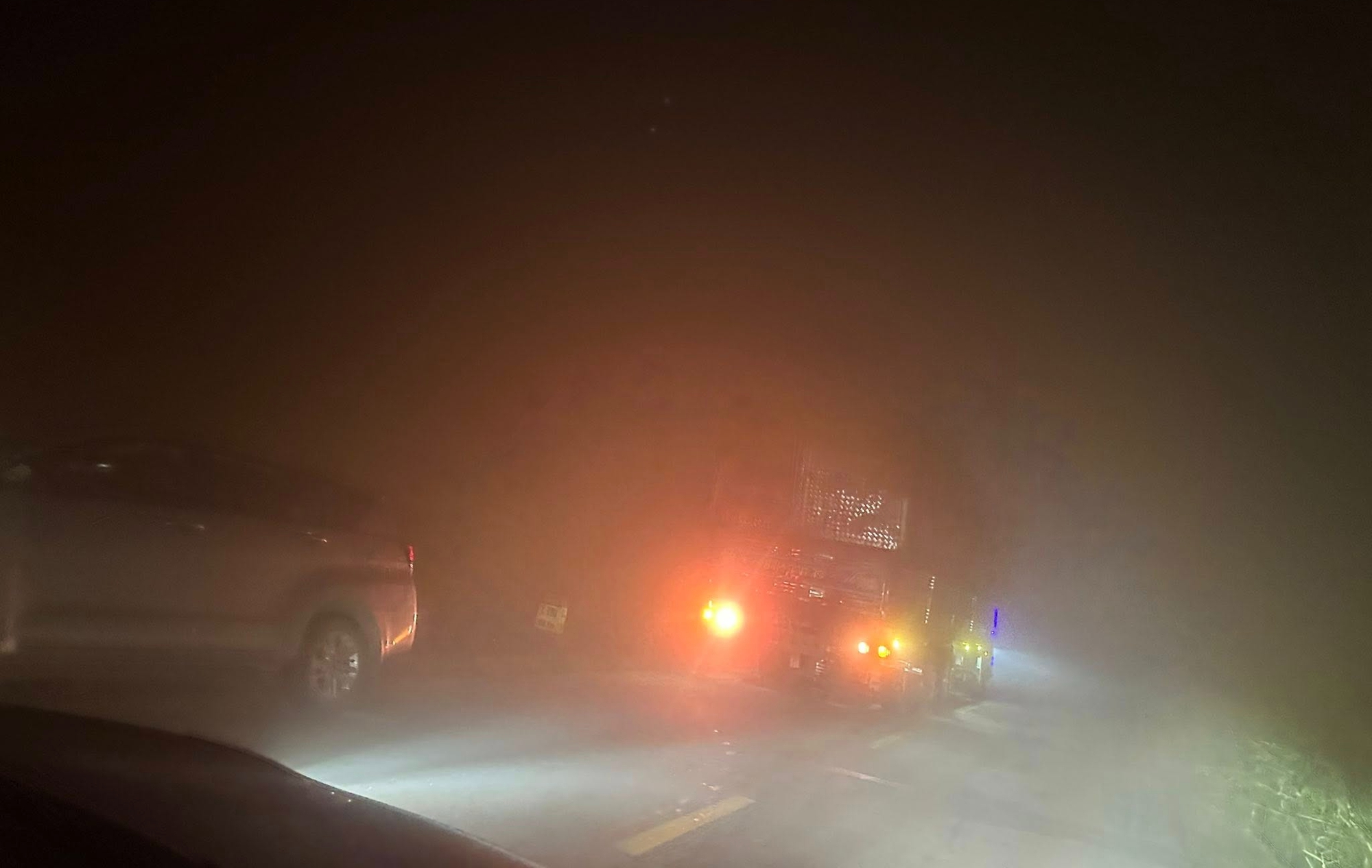 Sương mù dày đặc trên QL24 khiến giao thông qua lại gặp nhiều khó khăn, nguy cơ tai nạn.