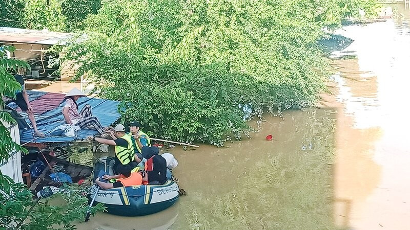 Lũ ngập đến mái nhà, lực lượng cứu hộ đón vợ anh Ngô Văn Hùng ở tổ 17, phường Phan Đình Phùng đến nơi an toàn.