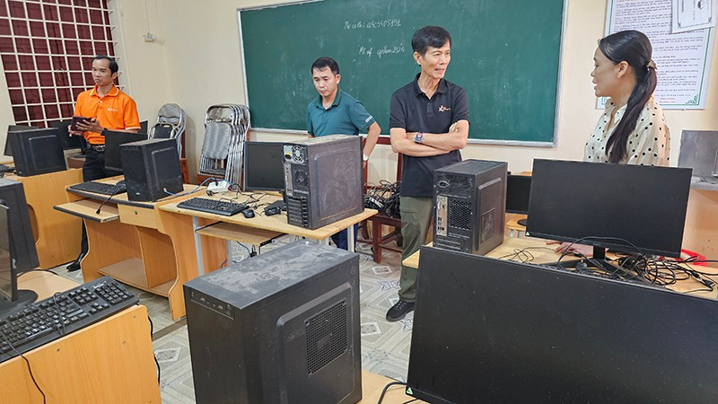 Triều cường, mưa lũ gây ngập phòng học, hư hỏng máy tính của trường học ở xã Tiên Trang, tỉnh Thanh Hóa.