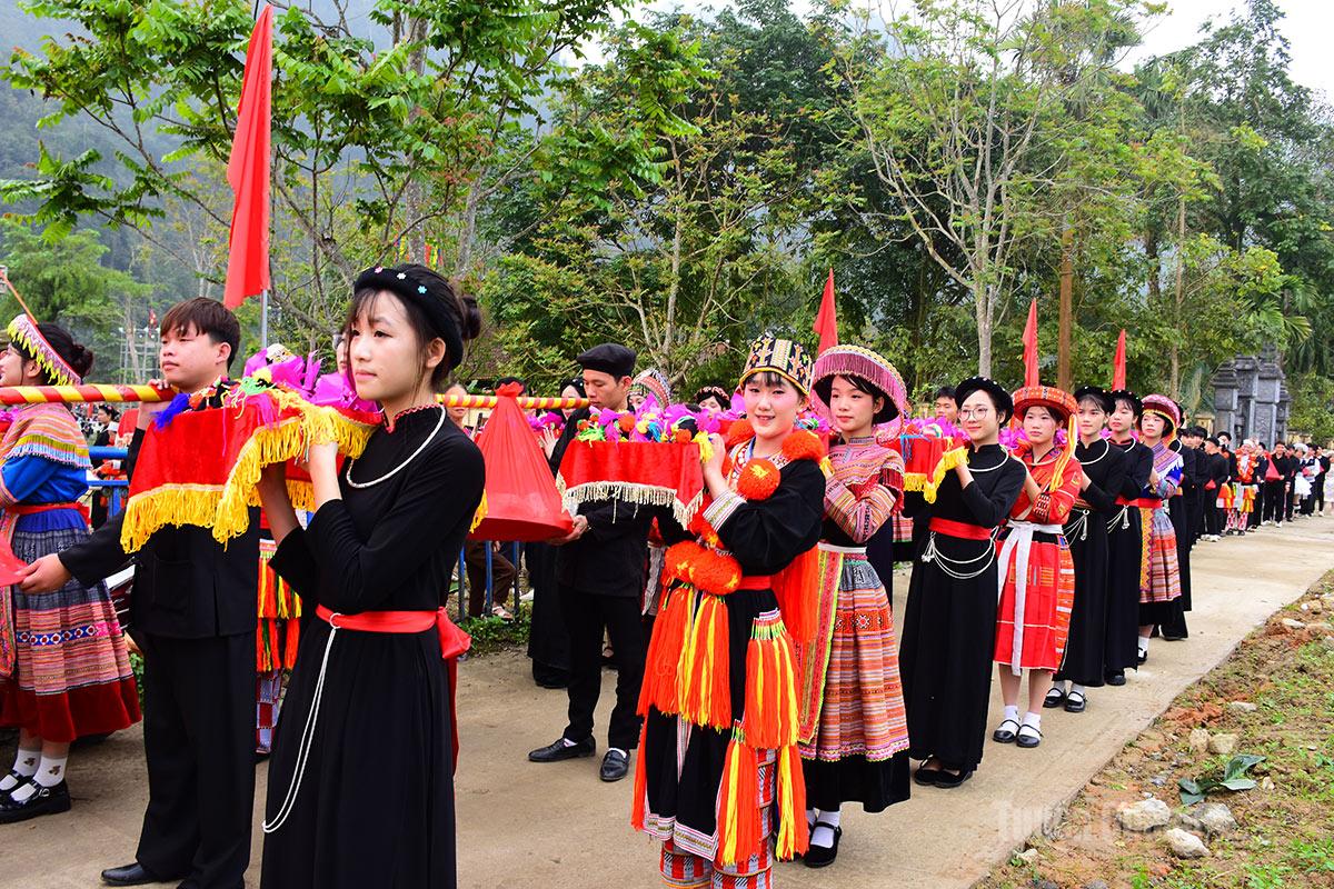 Đoàn rước mâm Tồng từ Đền Pú Bảo về nơi tổ chức Lễ hội Lồng Tông.