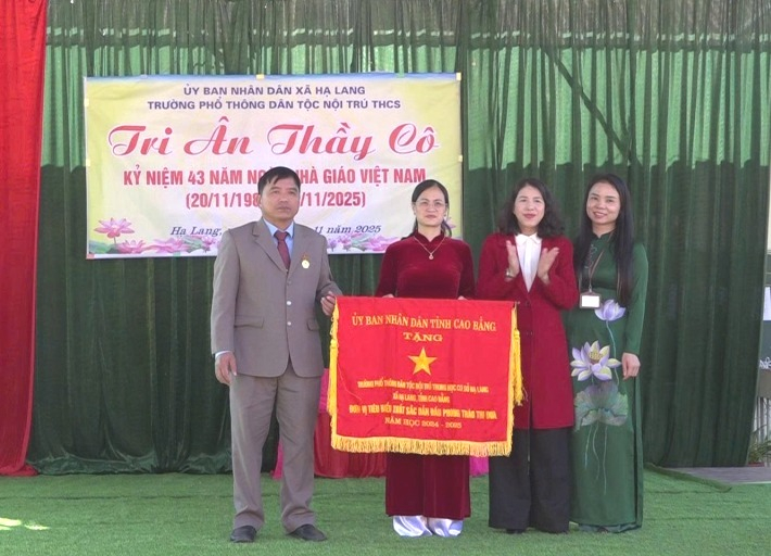 Thừa ủy quyền của UBND tỉnh, lãnh đạo xã Hạ Lang trao tặng Cờ thi đua tiêu biểu xuất sắc trong các phong trao thi đua năm học 2024 - 2025 cho Trường Phổ thông Dân tộc nội trú THCS Hạ Lang.