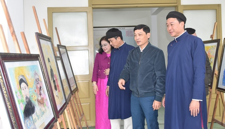 Tham quan Triển lãm tranh "Di sản Phan Bội Châu" do các học sinh Trường Trung học cơ sở Phan Sào Nam thực hiện.