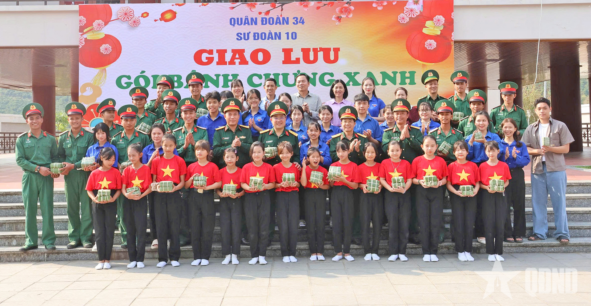 Đại tá Lê Văn Hùng, Phó chủ nhiệm Chính trị Quân đoàn 34 và các đại biểu tham gia gói bánh chưng.