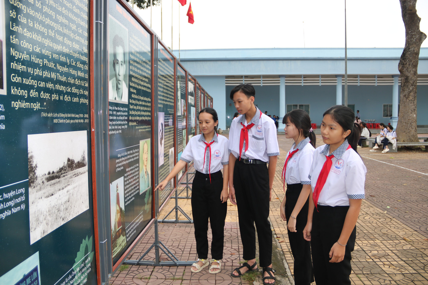 Học sinh tham quan khu triển lãm ảnh kỷ niệm 85 năm Ngày Khởi nghĩa Nam Kỳ.