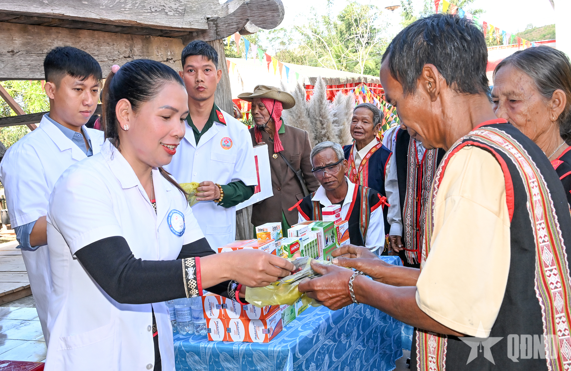 Đội ngũ y, bác sĩ của Đoàn Kinh tế - Quốc phòng 78 cấp thuốc miễn phí cho người dân.