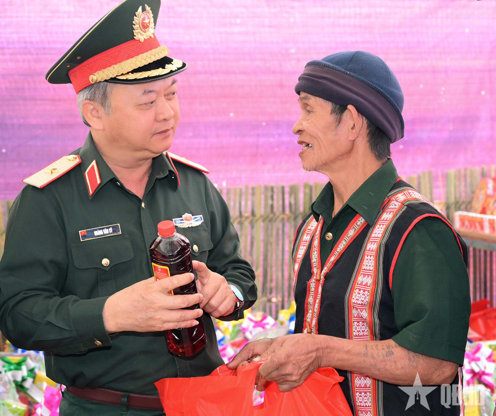 Thiếu tướng Hoàng Văn Sỹ trao quà tặng người dân.