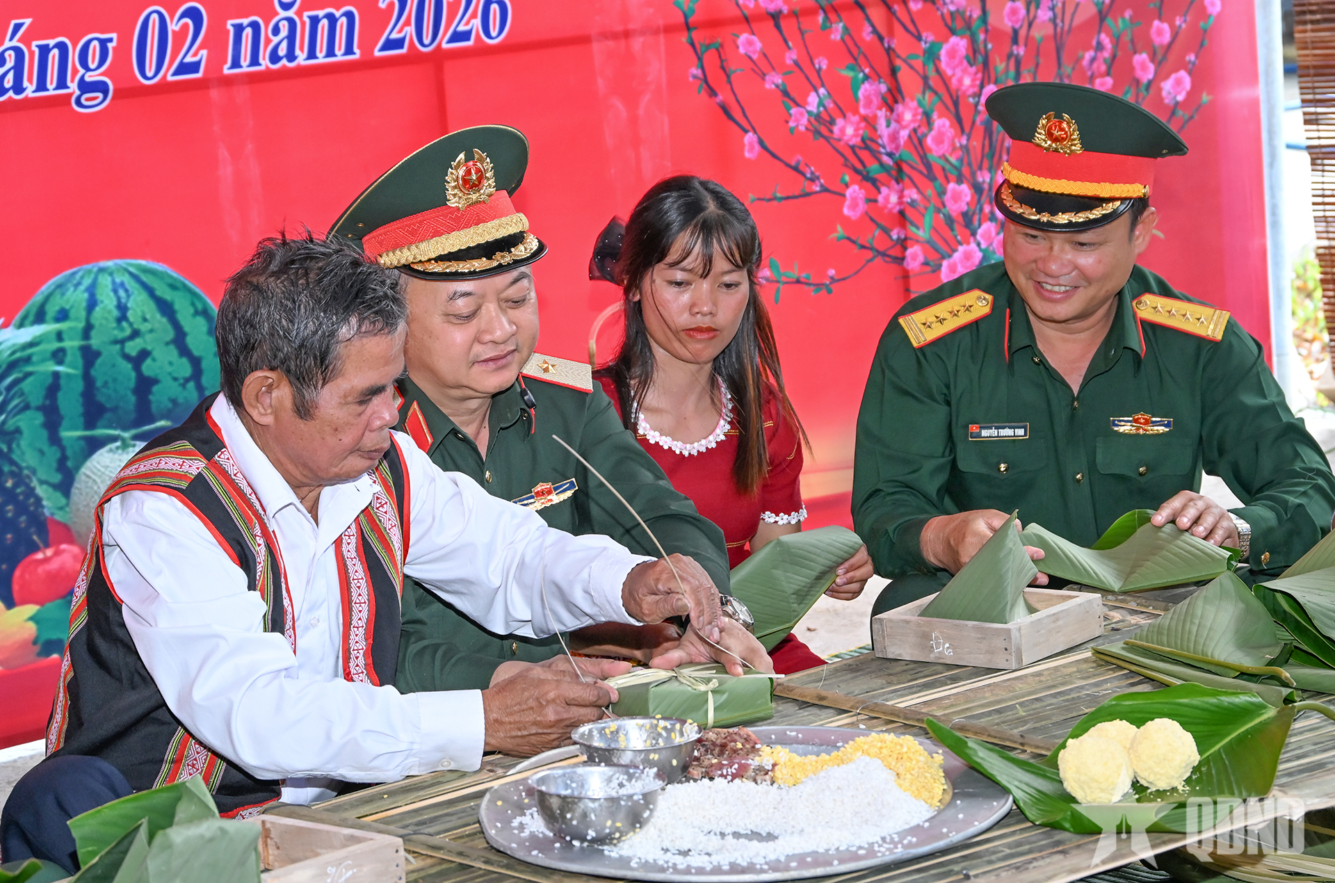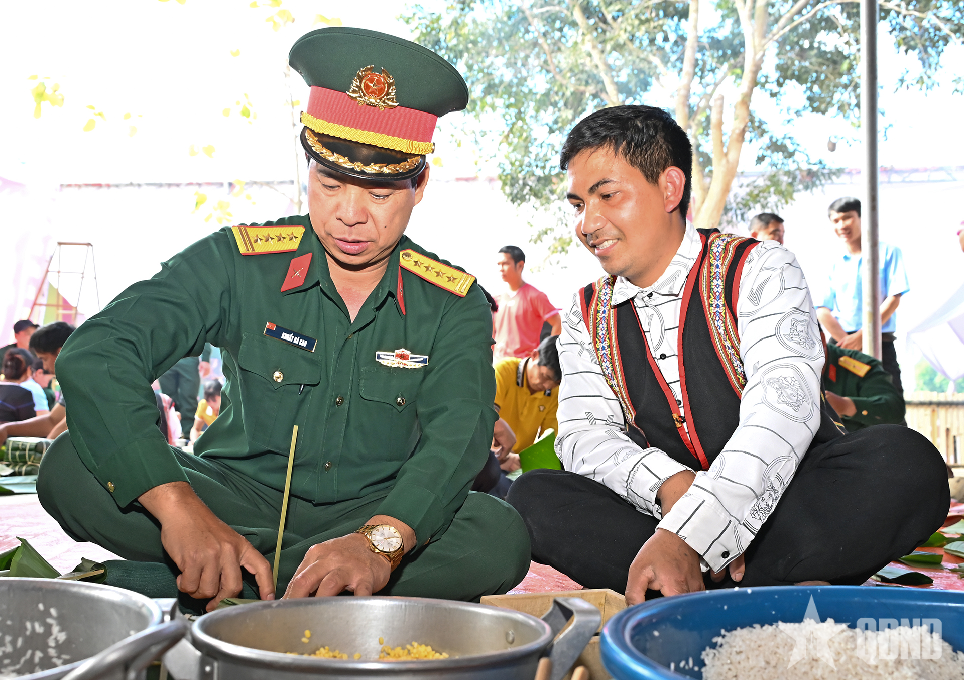 Thiếu tướng Hoàng Văn Sỹ, lãnh đạo Cục Chính trị Quân khu 5, Đoàn Kinh tế - Quốc phòng 78 tham gia gói bánh chưng với người lao động và nhân dân.