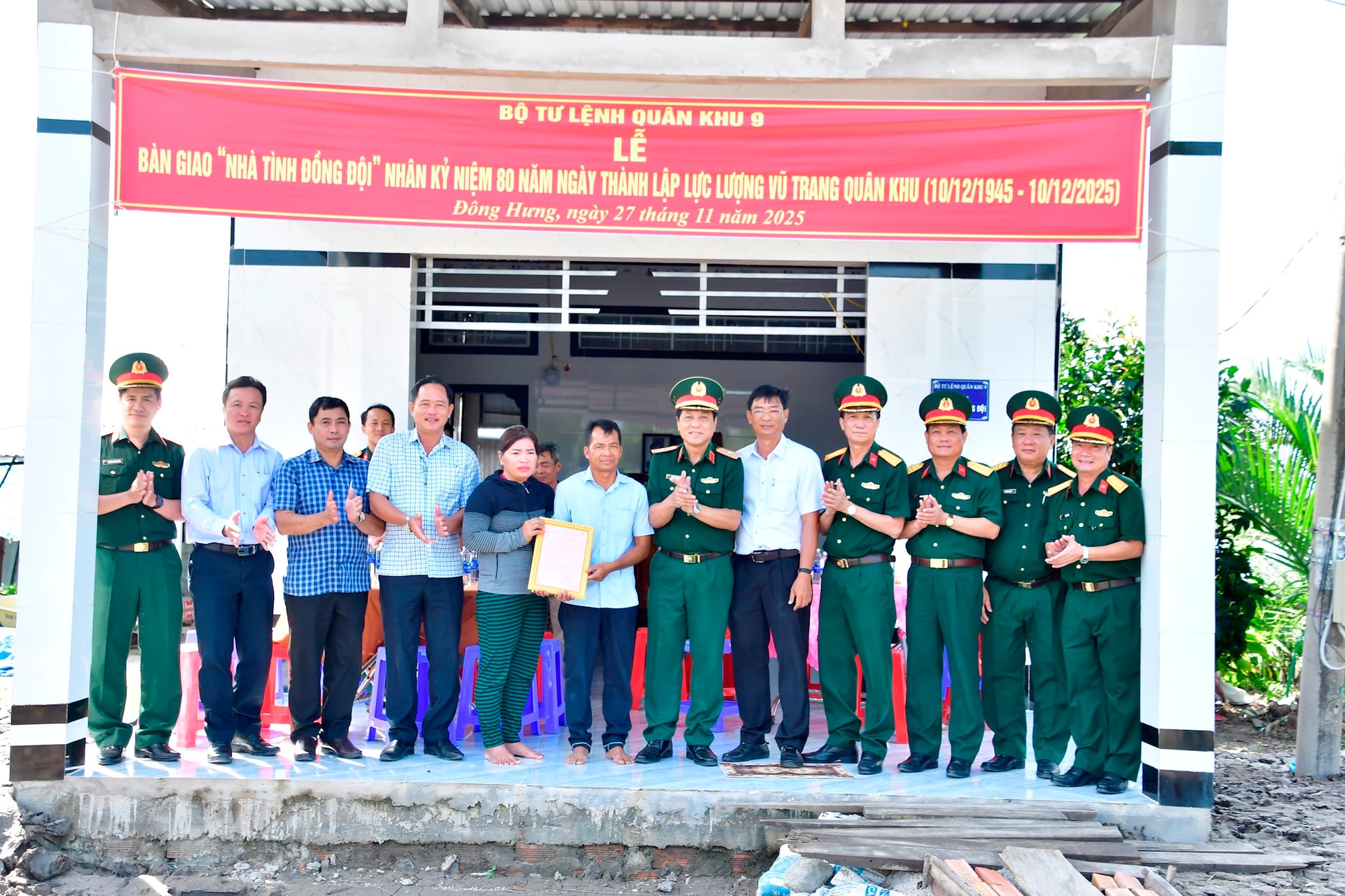 Đại diện Bộ Tư lệnh Quân khu 9 bàn giao nhà đồng đội và tặng quà cho các gia đình