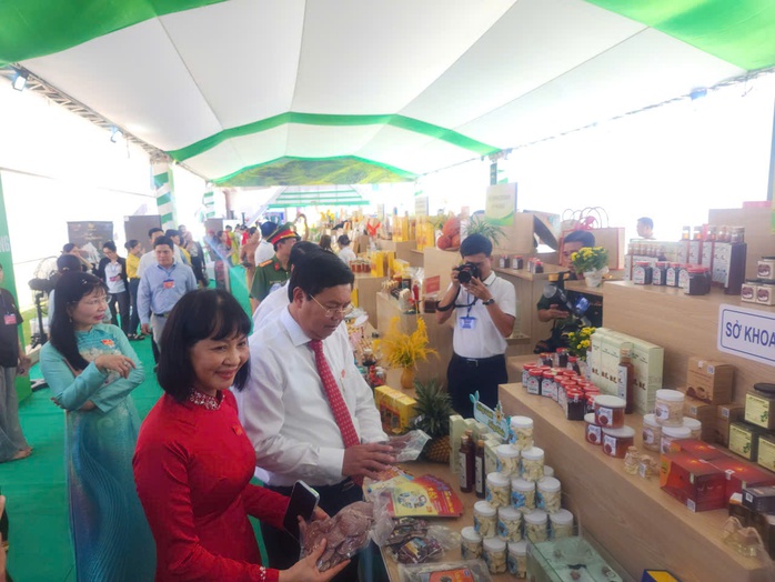 Bí thư Tỉnh ủy An Giang cùng các đại biểu tham quan khu trưng bày thành tựu kinh tế xã hội tỉnh giai đoạn 2021-2025
