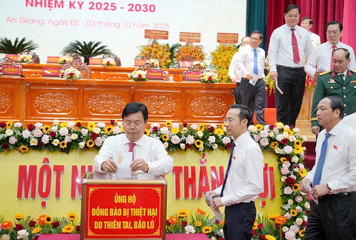 Ông Nguyễn Tiến Hải, Bí thư Tỉnh ủy An Giang, mở đầu đoàn đại biểu quyên góp giúp đỡ đồng bào bị thiệt hại do bão số 10