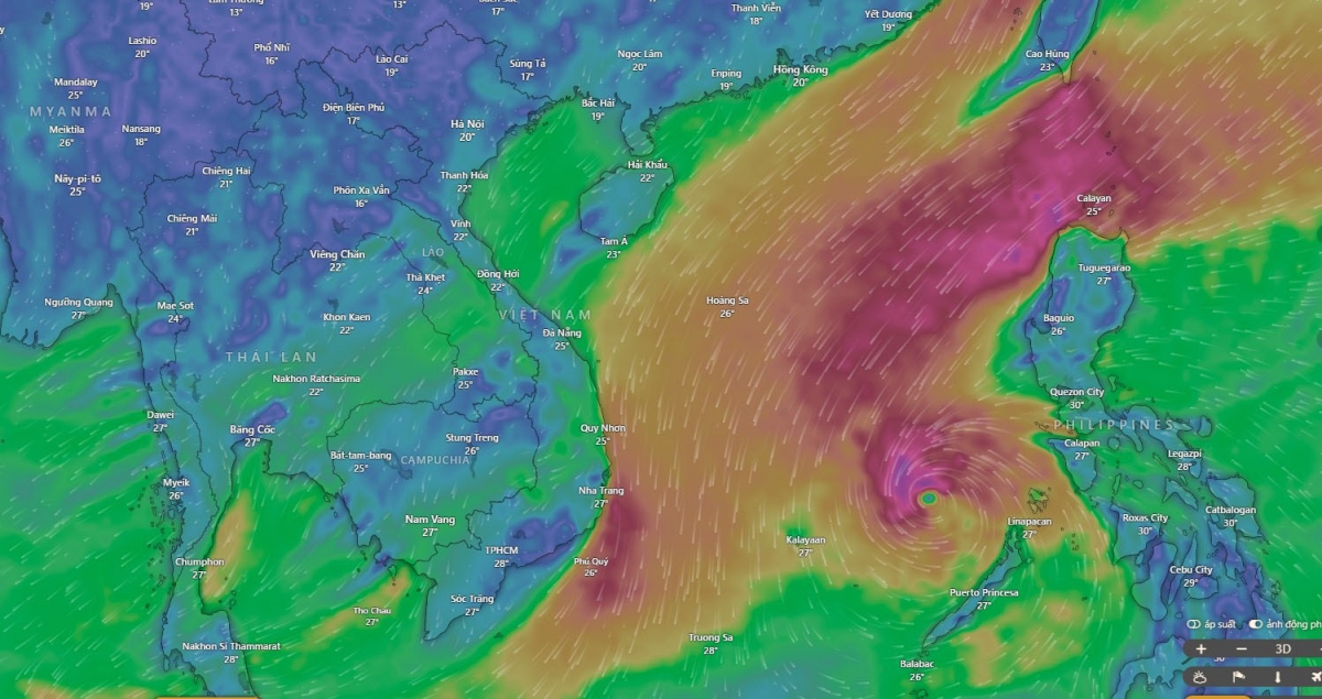 Từ chiều tối 25/11, vùng biển phía Đông khu vực Giữa và Nam Biển Đông có gió mạnh dần lên cấp 6-7; vùng gần tâm bão mạnh cấp 8, giật cấp 10, sóng biển cao 3,0-5,0m. Biển động mạnh. Cảnh báo, trong khoảng đêm 26-28/11, khu vực Giữa và Nam Biển Đông (bao gồm vùng biển phía Bắc đặc khu Trường Sa) có khả năng chịu tác động của gió mạnh cấp 9-10, giật cấp 13. Tàu thuyền hoạt động trong các vùng nguy hiểm nói trên đều có khả năng chịu tác động của dông, lốc, gió mạnh, sóng lớn.
