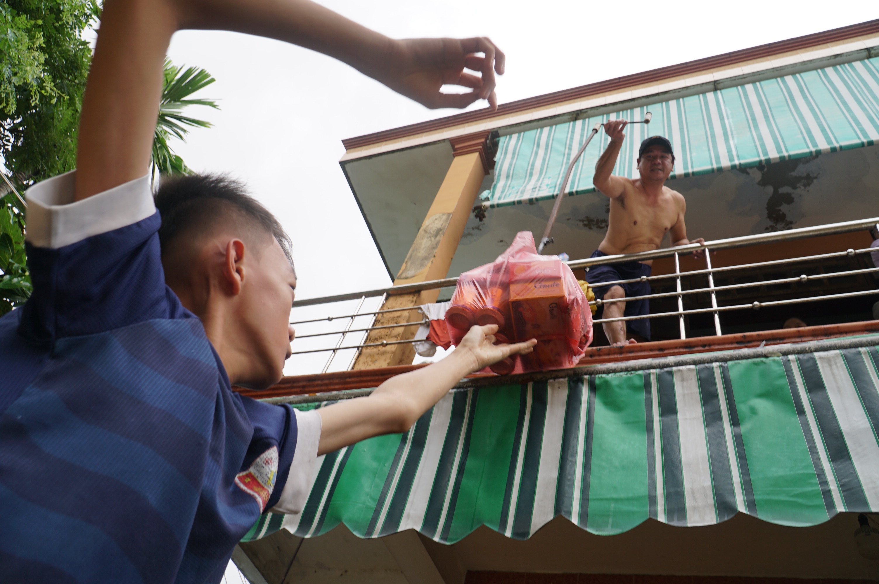 Người dân thay phiên nhau vào khu ngập lụt để tiếp tế. Ảnh: XUÂN QUỲNH