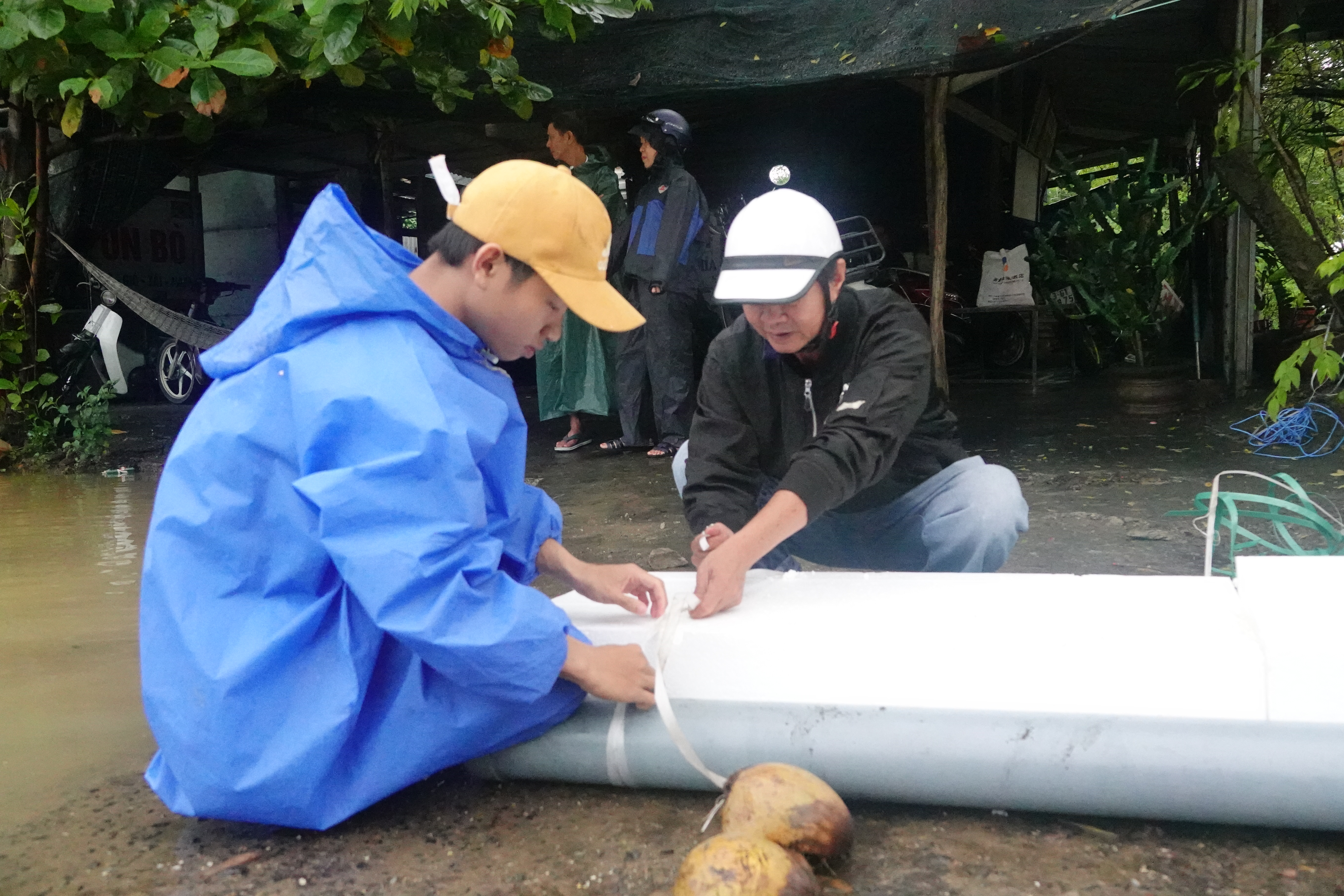 Người dân làm vật dụng tự nổi để vào khu ngập lụt. Ảnh: XUÂN QUỲNH