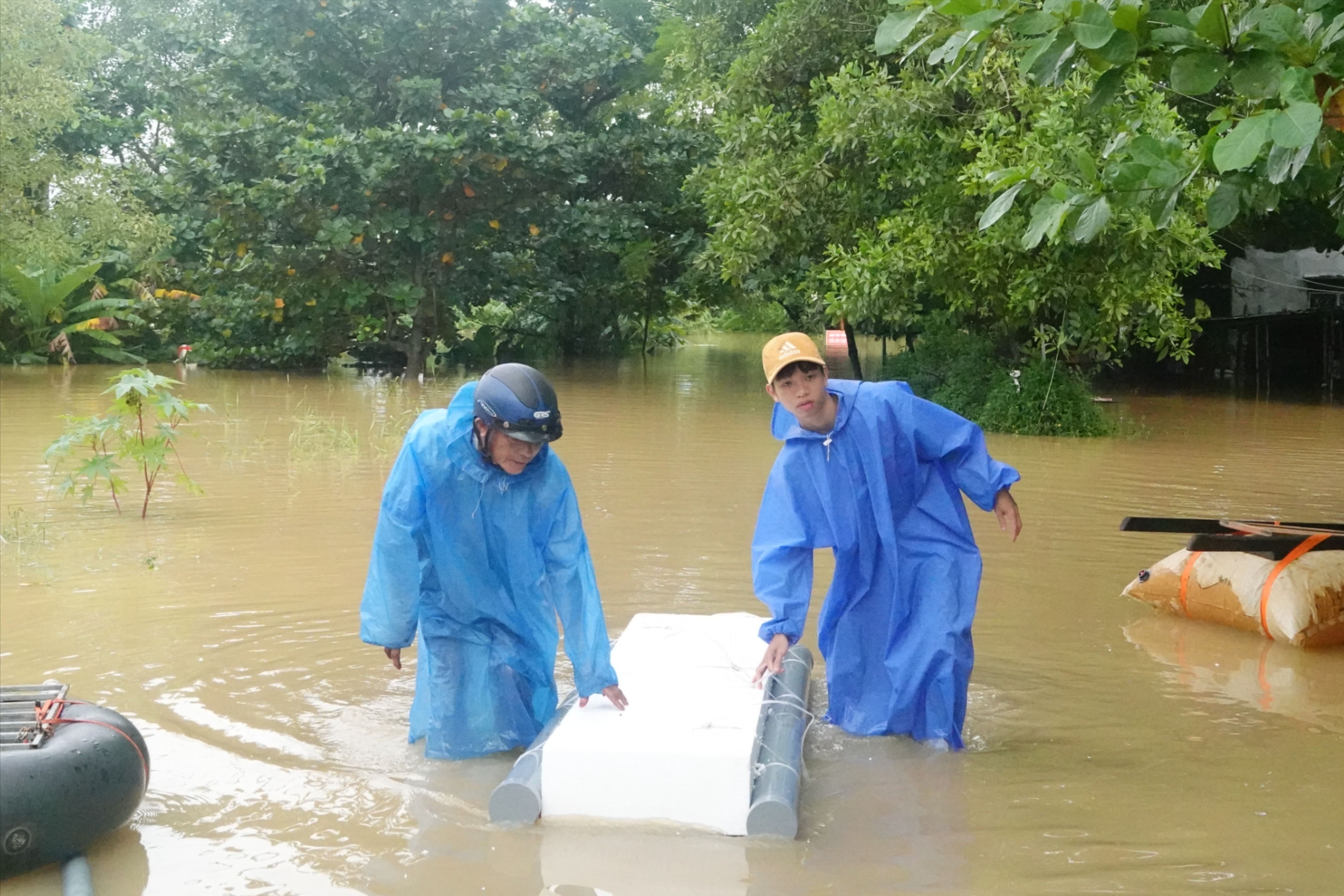 Hỗ trợ nhu yếu phẩm cho người dân vùng ngập lụt. Ảnh: XUÂN QUỲNH