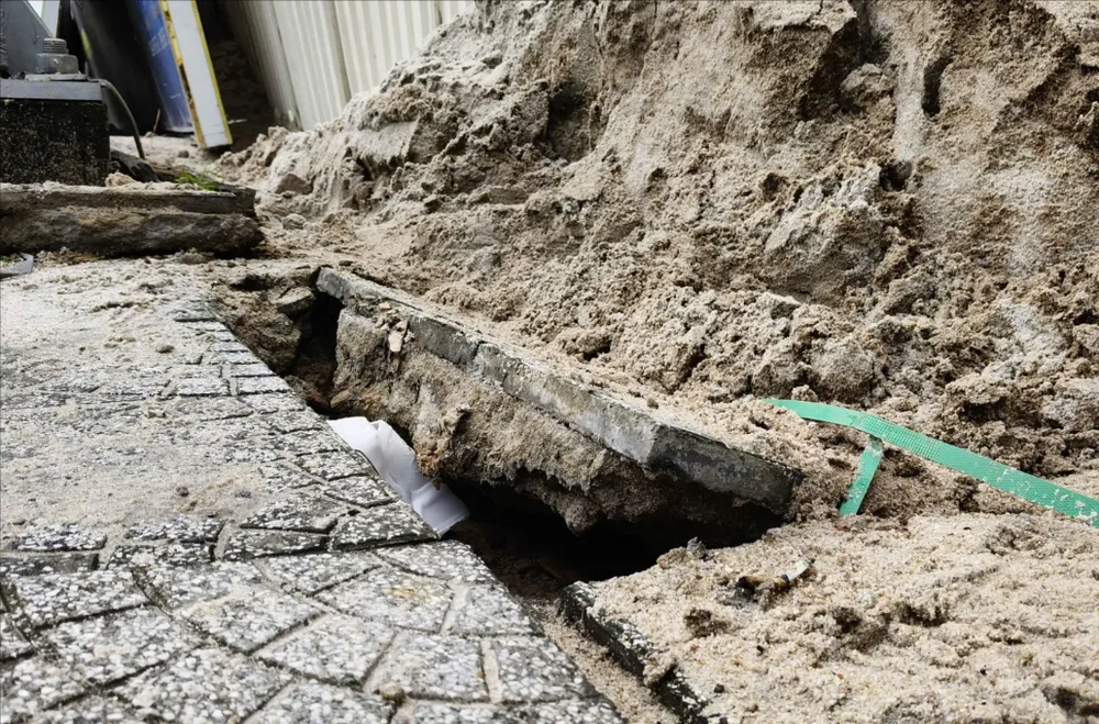 Khi trời mưa lớn, nước mưa kéo theo cát tại khu vực công trình lân cận vị trí tường vây bị hở chảy vào công trình, làm hổng nền móng, gãy cống thoát nước mưa nằm trên đường Nguyễn Công Trứ.