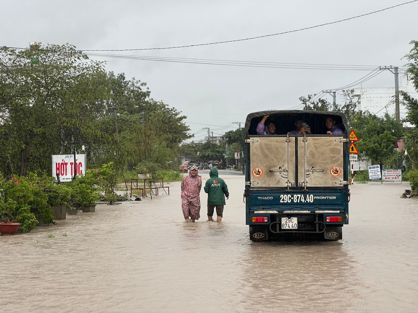 Xe tải hỗ trợ người dân qua vùng nước ngập trên quốc lộ 25 đoạn qua xã Phú Thiện.
