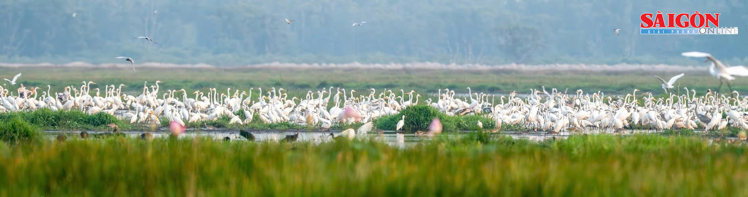 Tại các khu đồng cỏ, đầm nước và lung sen, nhiều loài chim như cò trắng, cò ốc, le le xuất hiện với mật độ dày. Đặc biệt, những đàn cò bay lượn theo từng nhóm lớn, đáp xuống kiếm ăn tạo nên khung cảnh tự nhiên sinh động.
